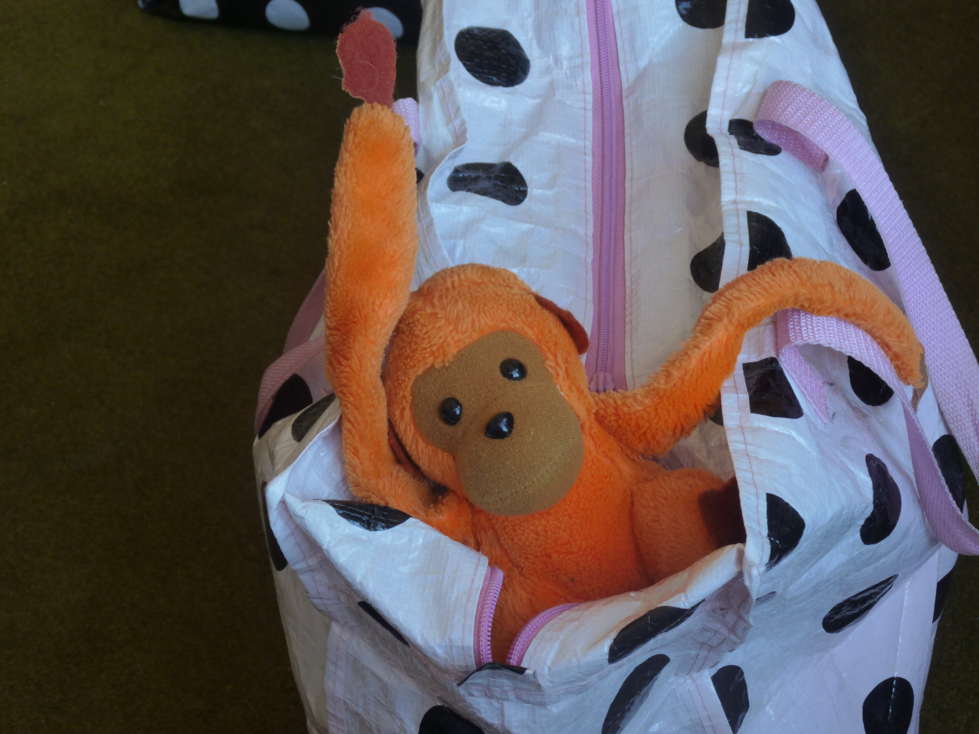PS: The bottom picture is of the bag of stones and the reed tray I use for making the sound of the sea. The other photos are of two of my three capacious storybags, all of which, by now, are in much need of replacement. It will be hard to see them go. Pink with black spots, black with white spots, striped in multi-colours: they’ve been such faithful friends.