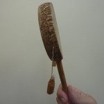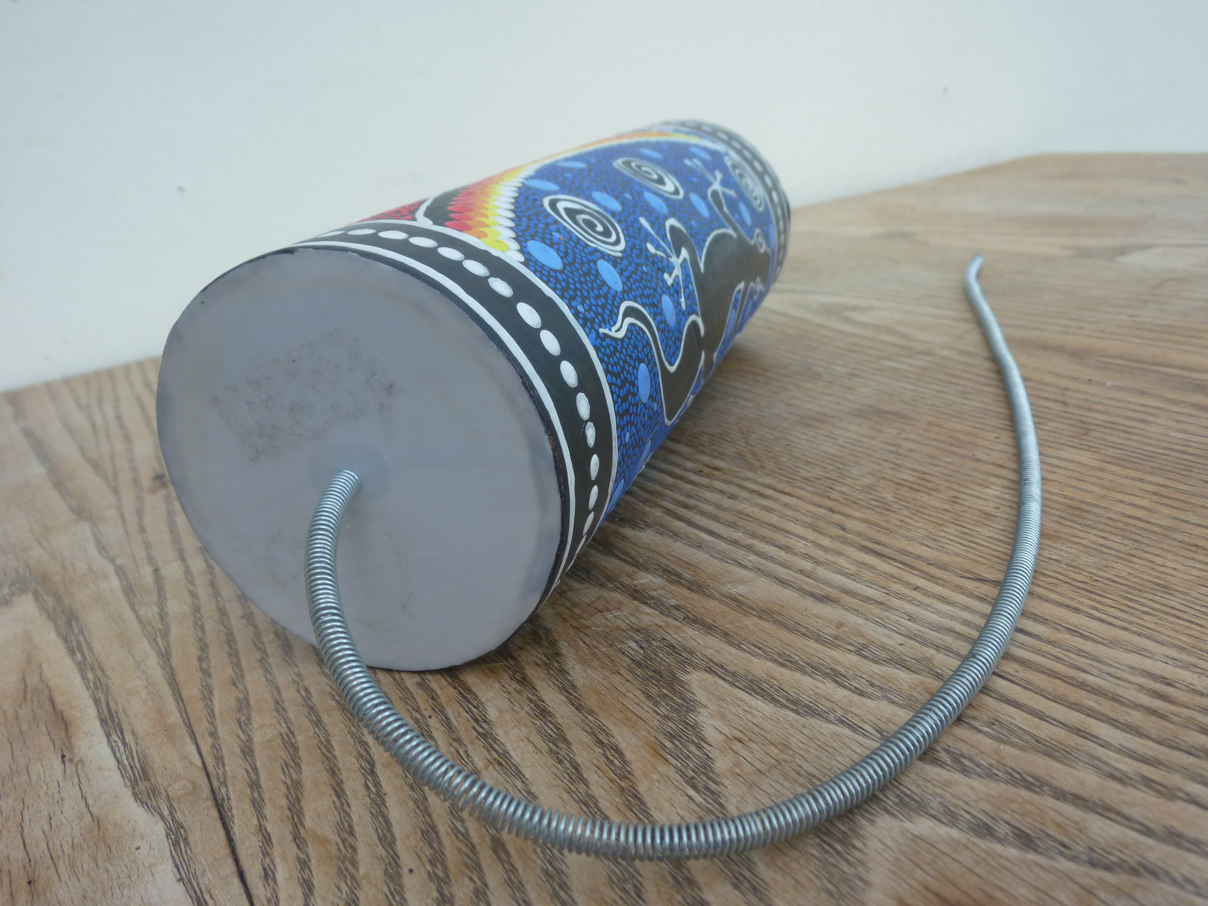 What about the type of hand-drum pictured here to the left? It, too, cuts through the sounds of chatter, creating anything from a gentle rattle to a demanding drum-roll of sound. Sometimes when I’m showing it round, I talk about it as if it was the face of a person, a face with appended ear-rings dangling down from its ear-lobes. And that’s what made one listener say in response, ‘Those are not ear-rings, those are milk-bottles, those are.’