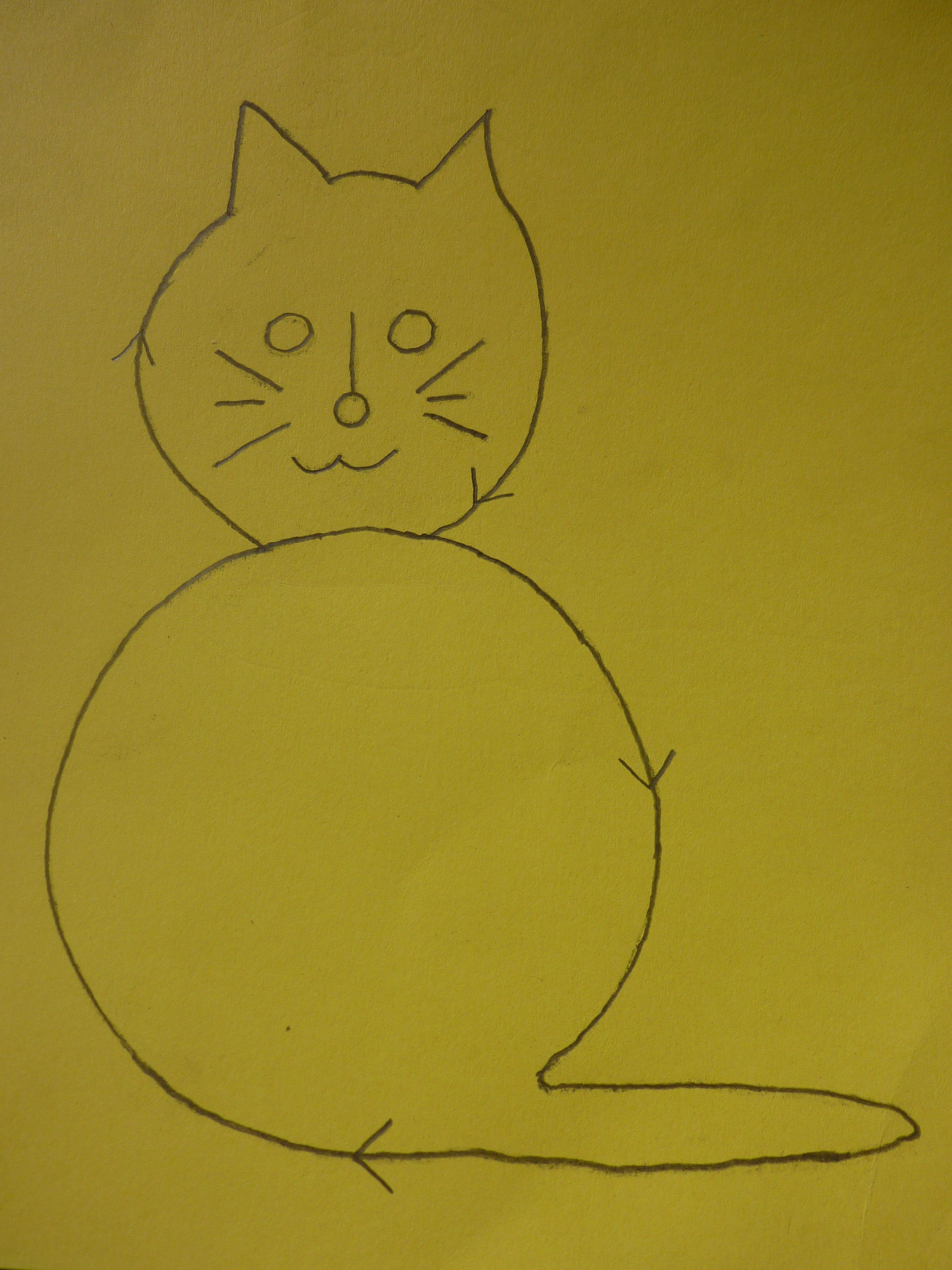 Once there was a flea who lived near a park. In the park were two beautiful lakes (draw the cat’s eyes) and near the lakes was a little hill (cat’s nose). At the bottom of the hill was a little pond (cat’s mouth) and beside the pond were long grasses (cat’s whiskers) and below it was a bench where old people could sit (cat’s mouth – and instead of a bench it could be a children’s paddling pool).
