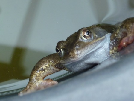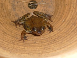 One evening during the week, another frog was spotted sitting on its haunches in our study, looking for all the world as if it wanted to talk. When and how it got into the study we had no idea. It was me who was deputed to be the one to remove it. So I performed the usual trick of fetching a plastic bowl, popping it suddenly over the frog, then sliding a piece of card underneath, thus temporarily trapping the frog inside. Out in the garden, it hopped quickly away.