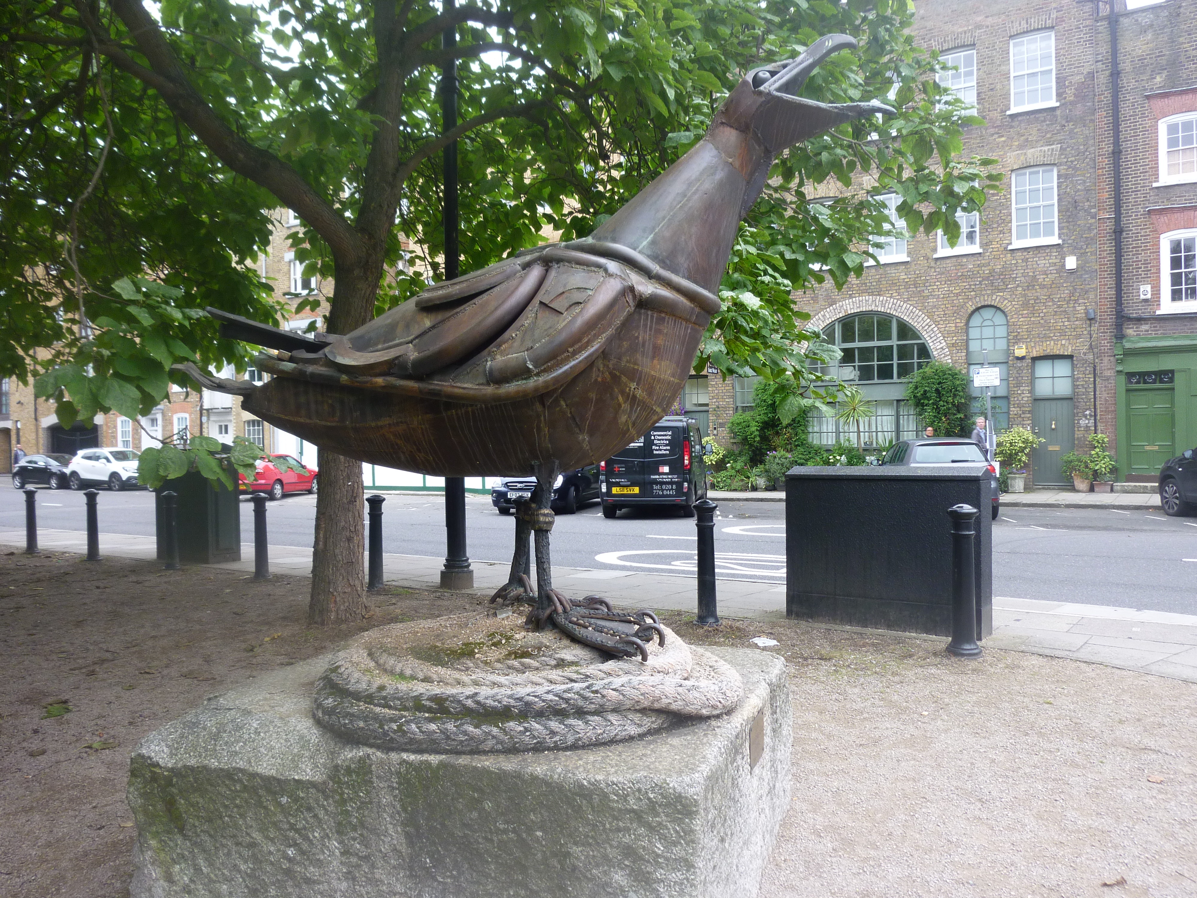 On one of those inward turns to Ropemakers’ Fields along Narrow Street in Wapping , surprisingly, suddenly, there it was: a massive metal herring gull standing open-beaked on a marvellously sculpted circle of rope.