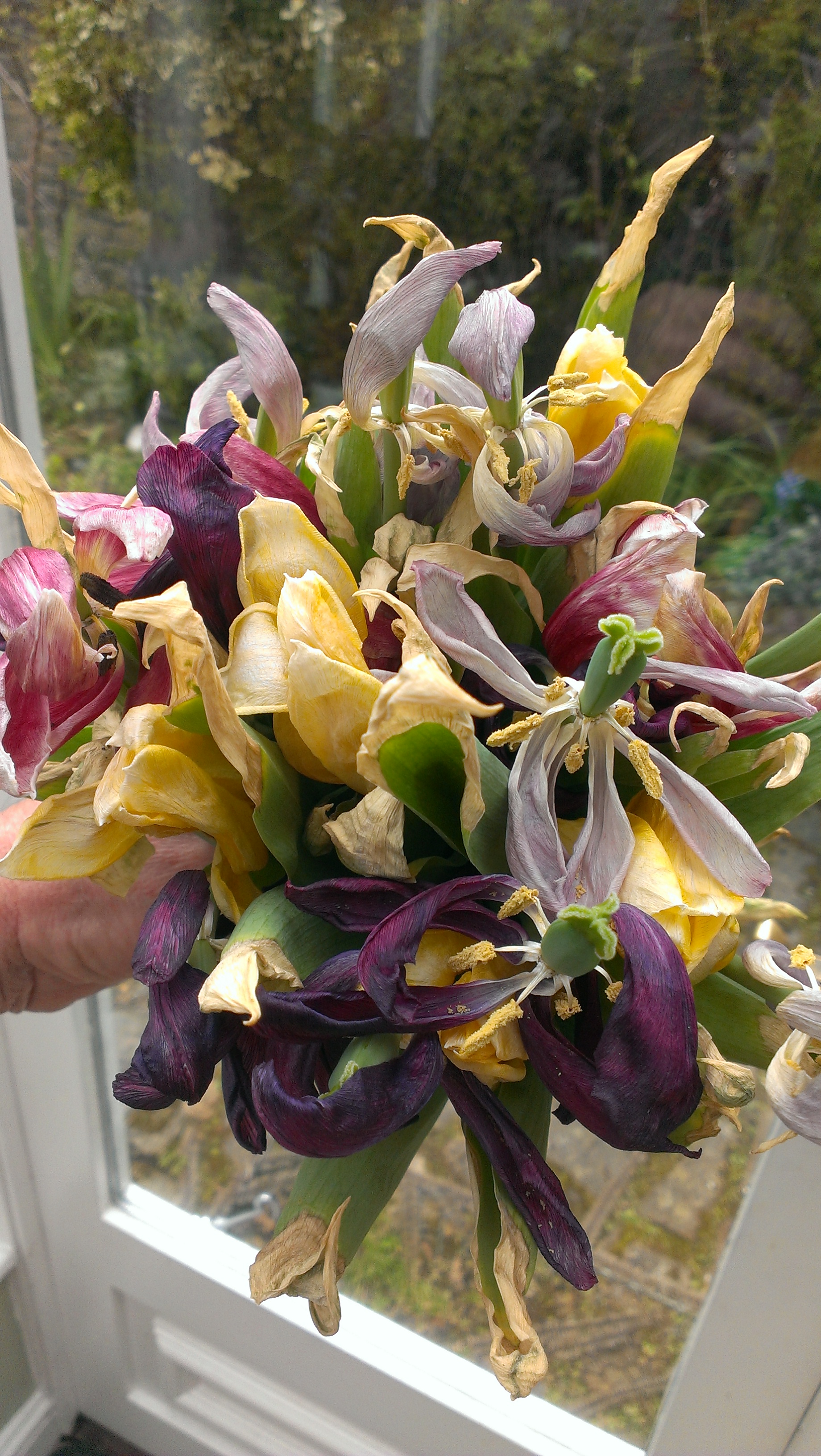 PS: My top photo this week is of the portrait of Africa on a kanga, a piece of material from Kenya. The bottom photo is of a bunch of tulips that had been in our kitchen for so long, it felt like they’d become old friends. We loved watching them as their petals folded and their colours gradually seemed to merge.