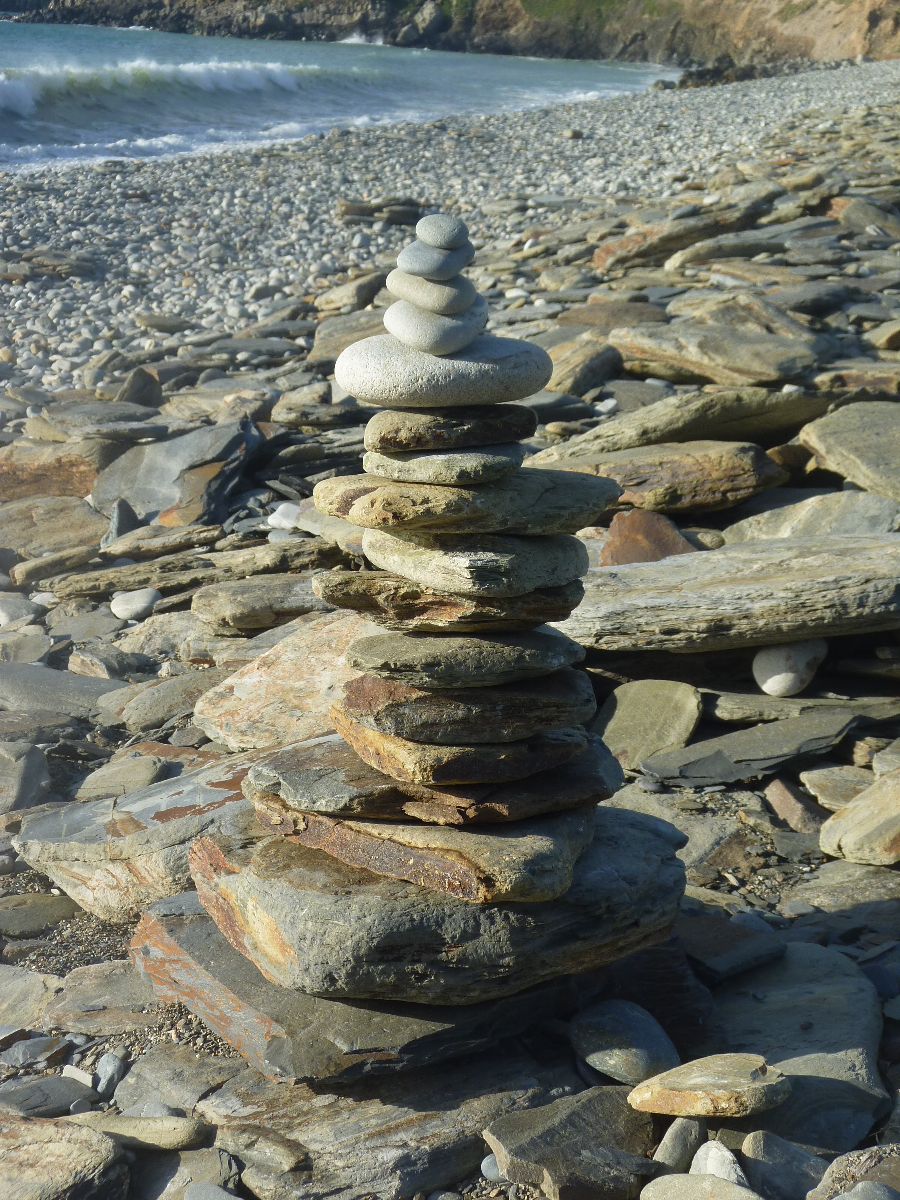 So you continue and when you reach the long tangle of intertwined boughs just before that stone pillar, remains of a long-ago project that would have created a vast harbour here, you know you are now within the smell and sound of the sea. So as you reach the narrow path that leads down to the pebble banks, you are full of anticipation, eager to see what kind of waves there will be and whether anyone has left some strange tower of stones somewhere along the length of the beach as a kind of tribute to the wind and the weather.